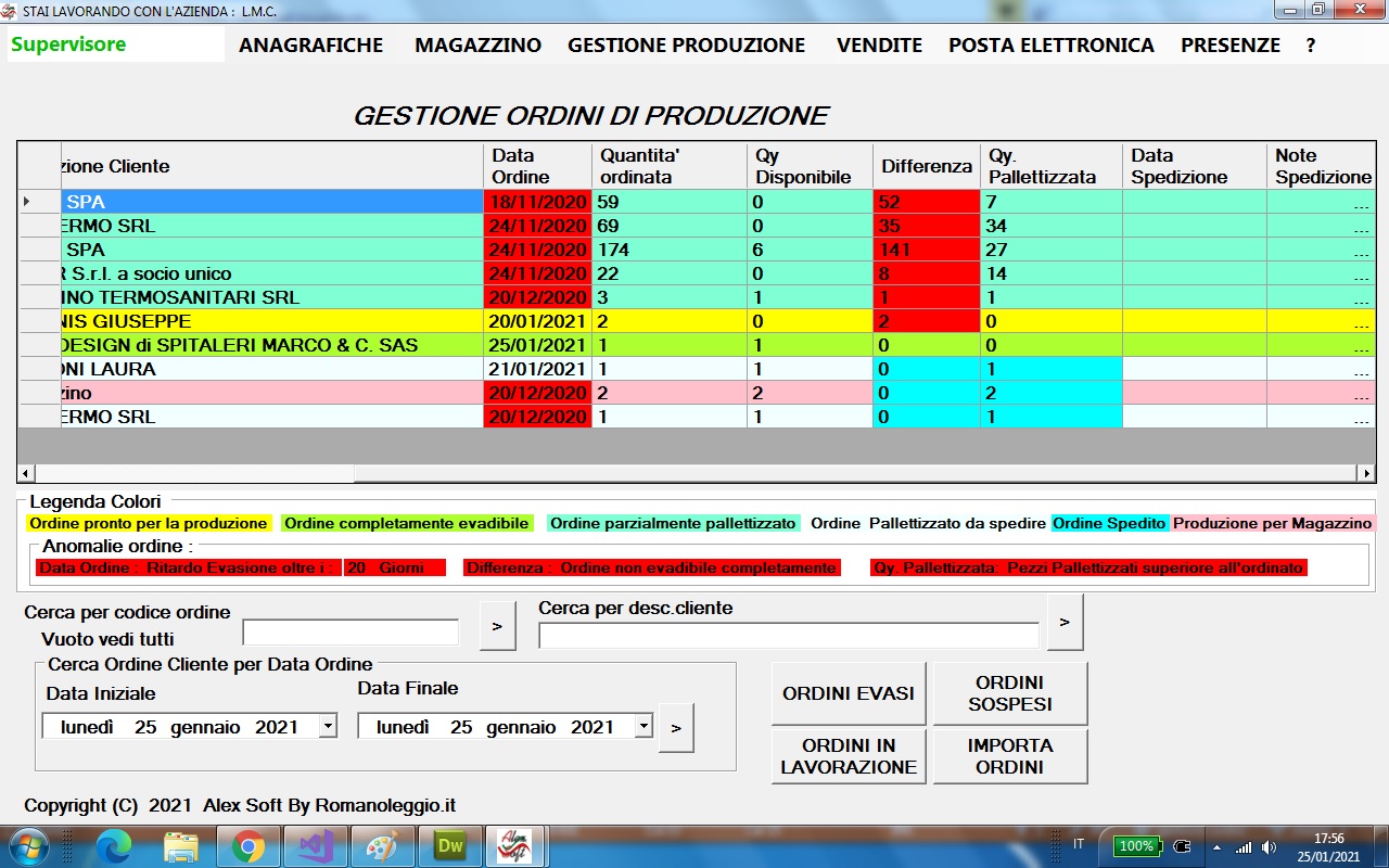 Sulla base della posizione e delle disponibilita' di magazzino ad ogni ordine e' assegnato un colore , es. Verde evasione possibile , Giallo produzione in corso ecc.ecc. vedi immagine