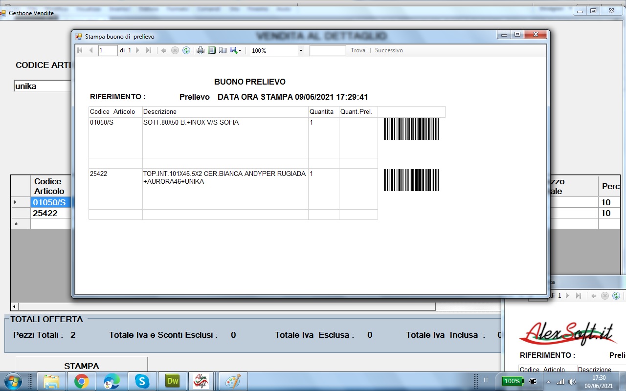 -- Gestione liste di prelievo in magazzino la funzione stampa il riepilogo degli articoli da prelevare con il relativo codice a barre clicca qui